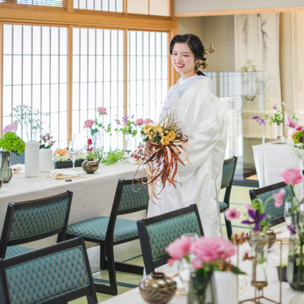 純日本風に統一され独立したプライベート空間での少人数の挙式+食事会プランが登場!窓の外には日本庭園が広がり自然に包まれているような佇まいで美食を楽しみながら家族とゆっくりお過ごしください