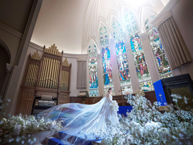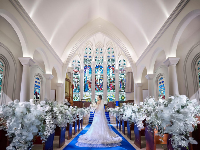【初めての式場見学の方限定で挙式料(22万円相当)が無料に】本物のステンドグラス×永遠を意味するロイヤルブルーのバージンロードの大聖堂を体感しよう。フェアでは本番さながらの入場体験も叶う♪