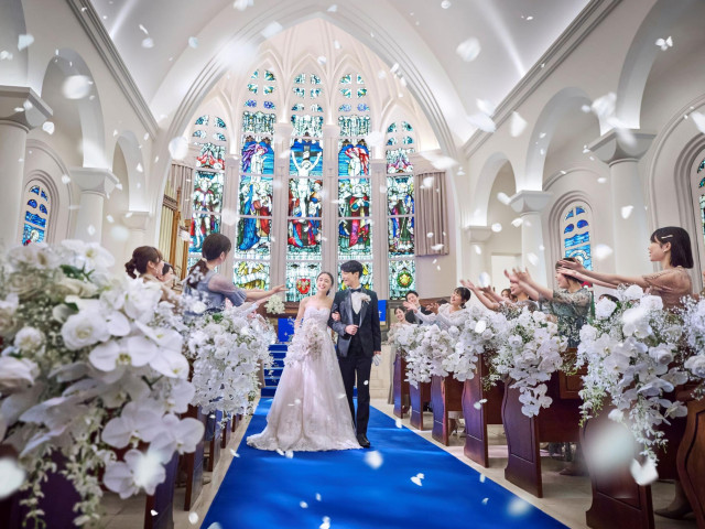 【初めての式場見学の方限定で挙式料(22万円相当)が無料に】本物のステンドグラス×永遠を意味するロイヤルブルーのバージンロードの大聖堂を体感しよう。フェアでは本番さながらの入場体験も叶う♪