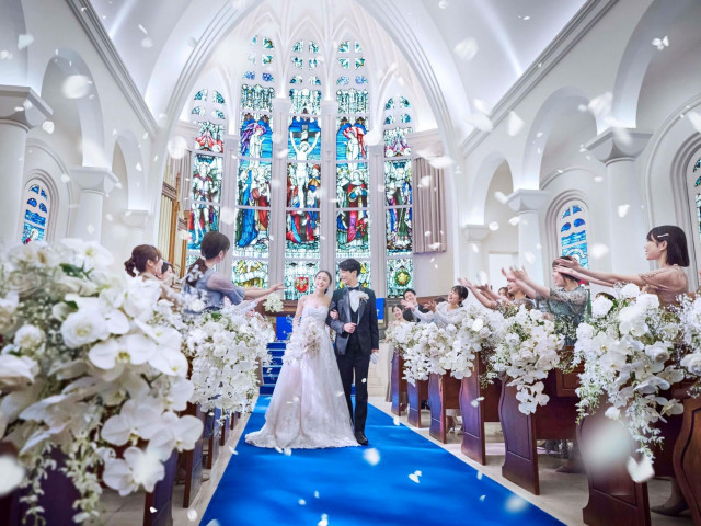 【初めての式場見学の方限定で挙式料(22万円相当)が無料に】本物のステンドグラス×永遠を意味するロイヤルブルーのバージンロードの大聖堂を体感しよう。フェアでは本番さながらの入場体験も叶う♪