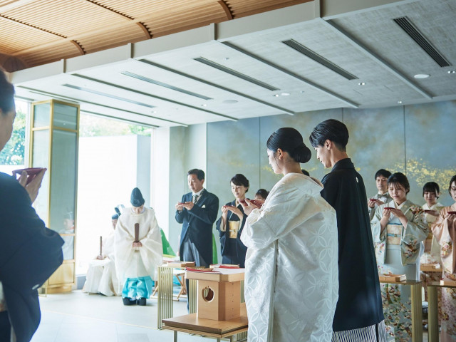 「開かれた儀式殿」がコンセプトの明治記念館内の神前挙式場をご案内。自然に包まれた開放的な空間は、これまでの神前挙式場と違い、伝統と革新が調和した唯一無二の空間に。
