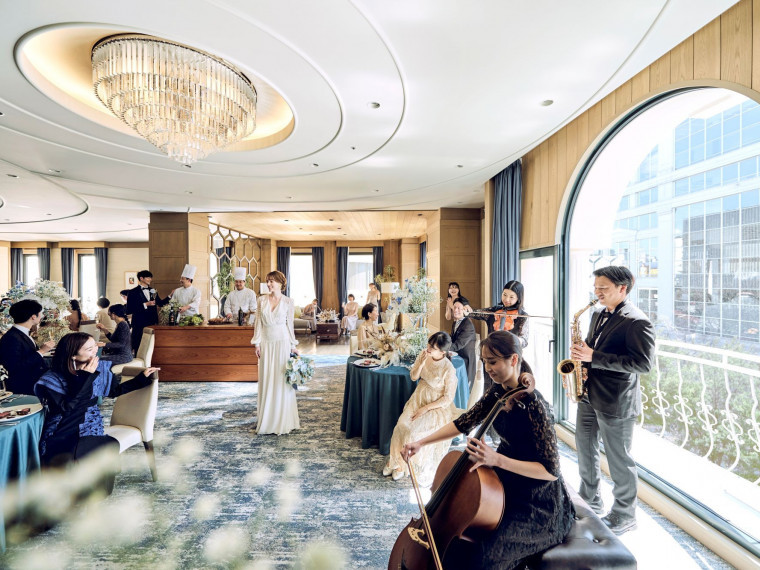この式を機に今後も皆様が繋がりを持ってほしい、そんな想いとおふたりの人生にかかせない音楽を合わせた『繋ぐ~ふたりのシンフォニー~』というコンセプトを提案。当日、ゲストにご協力いただき楽譜を作成。その曲を現在プロとして活躍中のゲストが生演奏。音符を繋ぎ、作り上げた1日。後日、おふたりは当館のレストランに来館。式後もおふたりと関係を繋ぐことができ、コンセプトウエディングを最も体現できたと実感しました。
