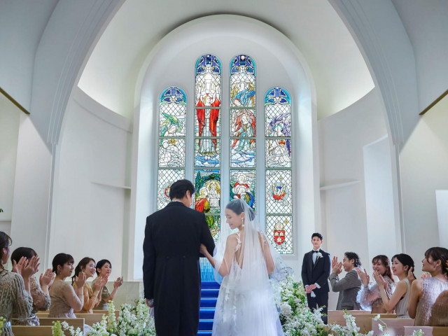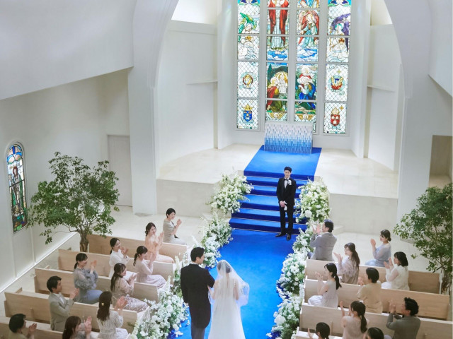 | おすすめ ポイント | 都内でも希少な独立型チャペルです。英国の教会から受け継がれたステンドグラスがふたりを迎え入れ、20mを誇る「ブルーのバージンロード」と天井高12mが人気。フラワーシャワー等は開放的な外で楽しめます。 |