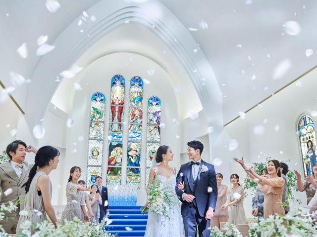 『憧れの挙式が全額無料(36万円相当)』光に導かれ未来を祝福する都内屈指の独立型大聖堂*ロイヤルブルーのバージンロードと洗練された空間で感謝と祝福を大切にした挙式。式後は憧れの大階段でフラワーシャワー