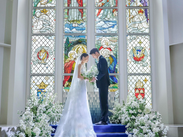 | おすすめ ポイント | 都内でも希少な独立型チャペルです。英国の教会から受け継がれたステンドグラスがふたりを迎え入れ、20mを誇る「ブルーのバージンロード」と天井高12mが人気。フラワーシャワー等は開放的な外で楽しめます。 |