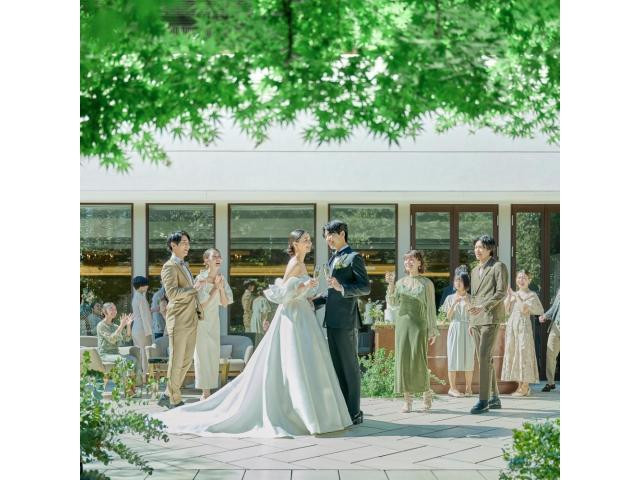 【ガーデン×ウェルカムパーティー】挙式の後は青空の下でゲストと楽しむウェルカムパーティー!披露宴前にたっぷりフォトタイムがあるのも魅力の1つ。フェアではオリジナルドリンクの体験でゲスト気分を味わって。