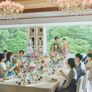 華やかな祝宴のテーブルを飾るのは、細やかな盛りつけや味付け、食材だけではなくお皿の温度にまでこだわった特別料理。味覚だけでなく五感すべてで楽しんでいただけるお料理を専属シェフが一皿一皿心を込めてお作りいたします。