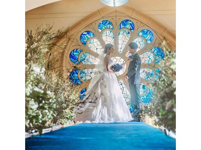 【150年もの歴史がある青のステンドグラス】「幸せを重ねる」そんな意味が込められた12枚の花びら型にラピスラズリが配され、そこから自然光が差し込む鮮やかな青色が特徴。ブルーローズセレモニーも人気