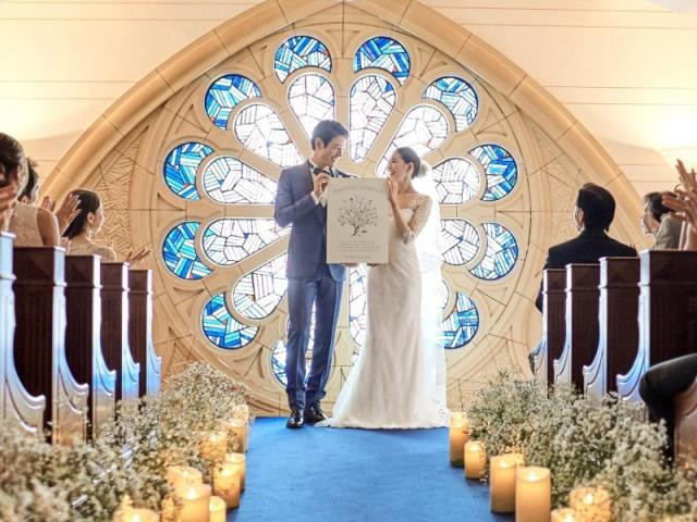 【150年もの歴史がある青のステンドグラス】「幸せを重ねる」そんな意味が込められた12枚の花びら型にラピスラズリが配され、そこから自然光が差し込む鮮やかな青色が特徴。ブルーローズセレモニーも人気