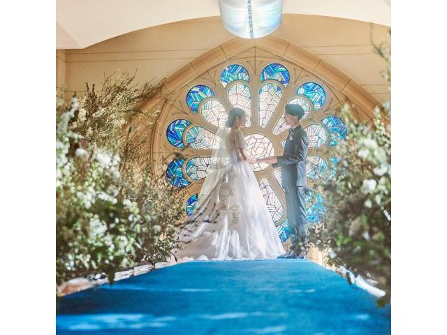 【150年もの歴史がある青のステンドグラス】「幸せを重ねる」そんな意味が込められた12枚の花びら型にラピスラズリが配され、そこから自然光が差し込む鮮やかな青色が特徴。絆を確かめ合る温かなセレモニー