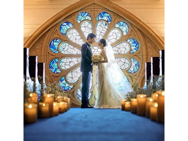おすすめ ポイント | 青いバラをモチーフにしたステンドグラスと、アフロディテオリジナルのブルーローズセレモニーで感動挙式が叶う |