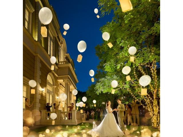 | ガーデン演出 | 有りゲストハウスに【専用のガーデン】を併設。ガーデン・テラスのデザートビュッフェでおもてなし。水辺でのバルーンリリースは開放感バツグン! |