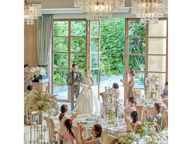 【緑豊かなガーデン併設&ライブキッチン付の選べる4つの会場】大きな窓から望むガーデンが併設された、開放的なパーティ会場◆緑豊かなガーデンを背景にした入場や階段入場も叶う◆140名着席可能な広さも魅力♪