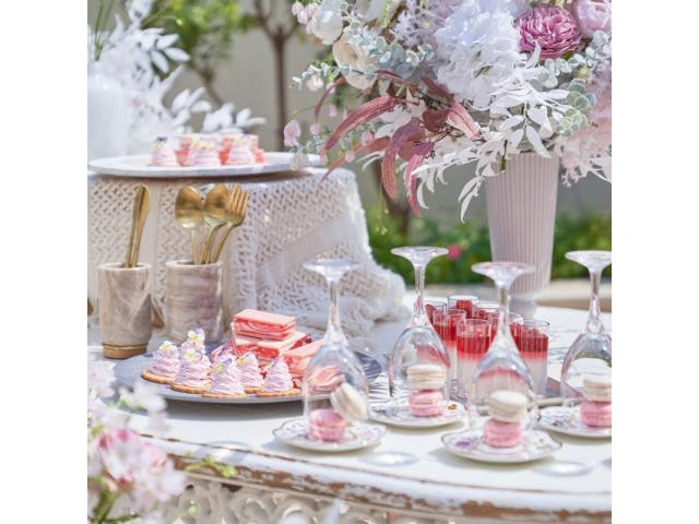 | ガーデン演出 | 有りゲストハウスに【専用のガーデン】を併設。ガーデン・テラスのデザートビュッフェでおもてなし。水辺でのバルーンリリースは開放感バツグン! |