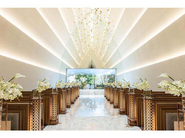 【天井に輝く無数のブリリアントフォール】シーンによって変化する光が反射して神秘的。花嫁のドレスや肌を綺麗に魅せるために計算されて創られた大理石×オフホワイトのスタイリッシュなチャペル