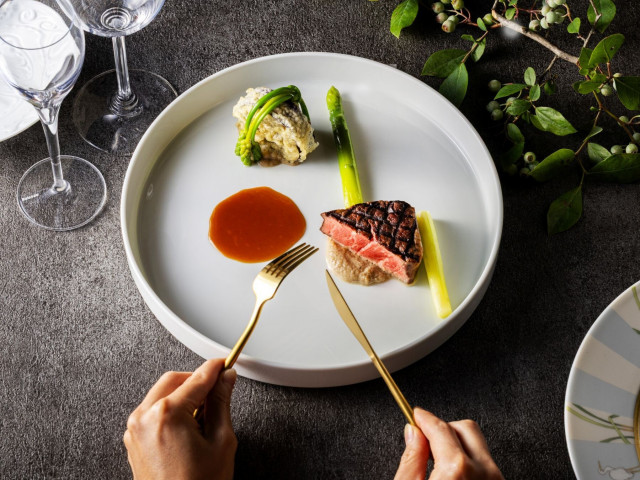 福岡市内で最も評価の高い、レストラン「ラ・ロシェル」の3万円4品ハーフコースをご用意。一皿ずつ丁寧にサービスされ「レストランに食事を愉しみに来た」そんな贅沢な時間をフェアでご提供