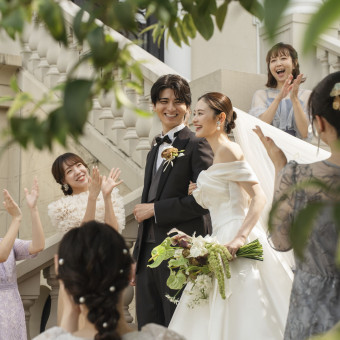 地下鉄天神駅から一駅という好アクセスでありながら、自然豊かな舞鶴公園が目の前に広がる非日常空間。独立型教会ならではの大階段では、憧れのフラワーシャワー演出が叶う。