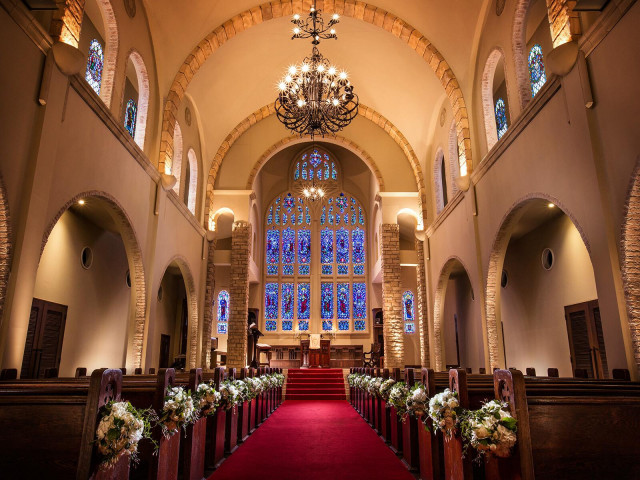 【200年の歴史薫る本格派大聖堂は福岡随一】30mのバージンロード&ステンドグラス/家族に想いを綴るメッセージシアター ※150名収容《2021年に海の見える新チャペル「Sea View」が待望のOPEN ※96名収容》