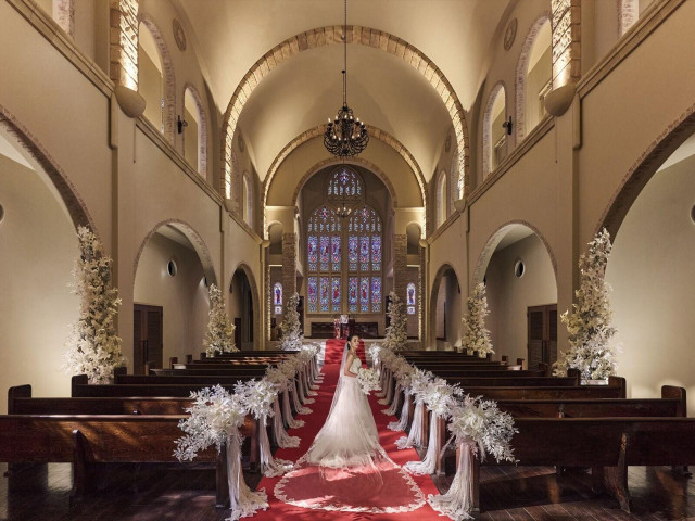 【200年の歴史薫る本格派大聖堂は福岡随一】30mのバージンロード&ステンドグラス/家族に想いを綴るメッセージシアター ※150名収容《2021年に海の見える新チャペル「Sea View」が待望のOPEN ※96名収容》