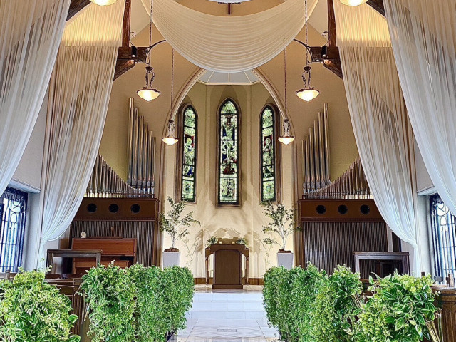 【やっぱり憧れ☆彡正統派大聖堂!】12mの長いバージンロードと輝くステンドグラス。両側の大きな窓からは自然光が差し込みバージンロードを歩く花嫁様を美しく輝かせます。