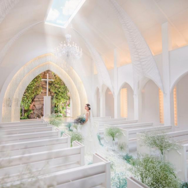 天窓から光が溢れる独立型チャペル”HIKARIの杜”挙式 牧師・聖歌隊2名・オルガニスト・ヴァイオリン奏者・フルート奏者・オリジナル結婚証明書・リングピロー(レンタル)・当日リハーサル※人前式も可能。