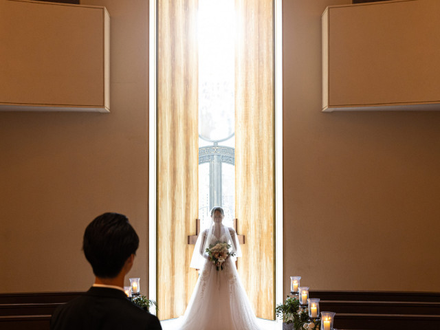 【家族と心繋がる挙式】天井高10m、5Mの入場扉が印象的なシンプルで落ち着いた独立型教会。本物のキャンドルと生花を設え、専任牧師による挙式本来の意味を大切にしたセレモニーが家族の絆をさらに深めてくれる