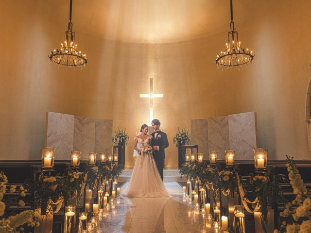 【心繋がる本格挙式】天井高10m、100名着席可能な幻想的な空間には「本物」のキャンドル・大理石のバージンロードを設え、専任牧師が贈る家族との繋がりを強く感じさせてくれる挙式は、ゲストの心にも強く刻まれる
