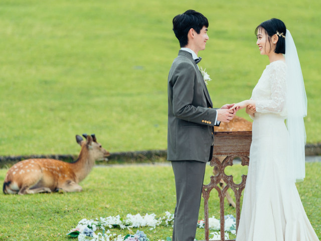 おすすめ ポイント | 天井からも自然光が差し、四季を通じて緑があふれる挙式会場。祭壇の奥に輝く緑がふたりの式を祝福。奈良公園の鹿も度々訪れ、一緒にお祝いしてくれる。 |