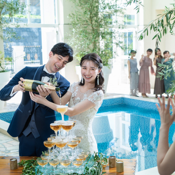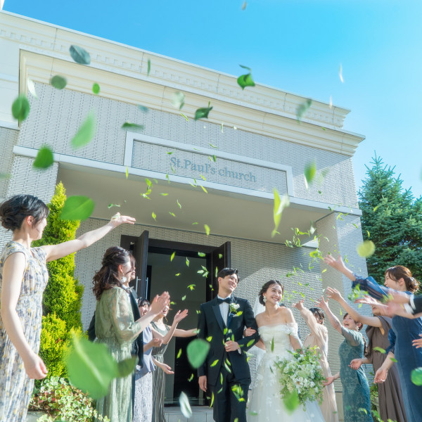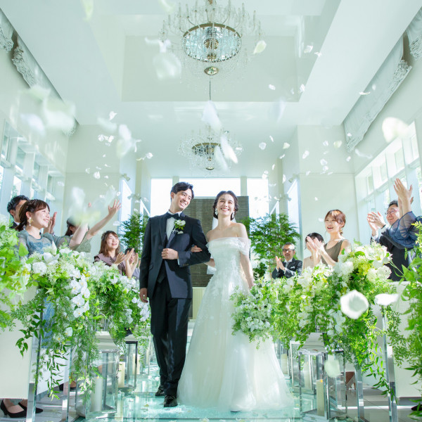 いっぱいに降りそそぐ光、祭壇に流れる水の音、鮮やかな緑に包まれた純白のチャペル。みんなの祝福の中へ踏み出すガラスのバージンロード。そのどれもが生涯忘れ得ぬ感動となってふたりの心に刻まれることでしょう。