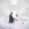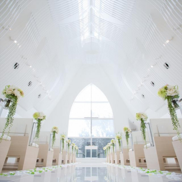 純白のチャペルで外国人牧師による正統派の挙式。 プロの聖歌隊とパイプオルガンの生演奏による美しい讃美歌の流れる中、感動のバージンロードを歩きます。 フェザーシャワーやカリヨン、ウェルカムドリンク付き。