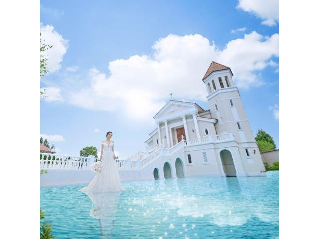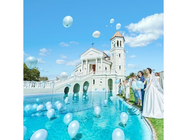 【水上に浮かぶ独立型大聖堂×ガーデンチャペル比較】天井高10M・バージンロード20Mの圧巻のスケール感。自然光が降り注ぎ青×白のコントラストが美しいと話題。広大なガーデンでガーデン挙式も可能!2つの