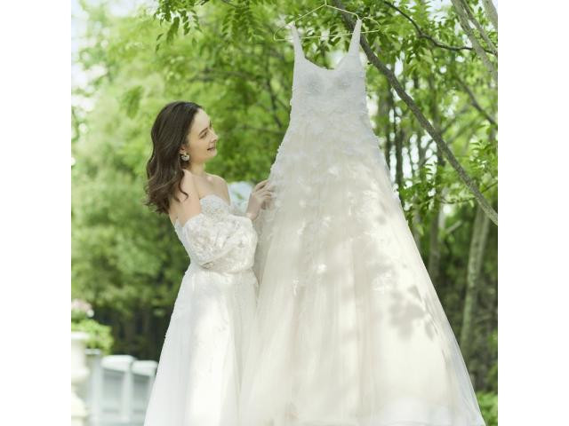 【ドレス試着体験】新作ドレス入荷を記念してドレス試着にご案内。館内にはフォトスポットも沢山。緑いっぱいガーデンや自然光差し込むチャペルに映えるとっておきの1着をご提案。組数限定の試着会なので必ず予約を