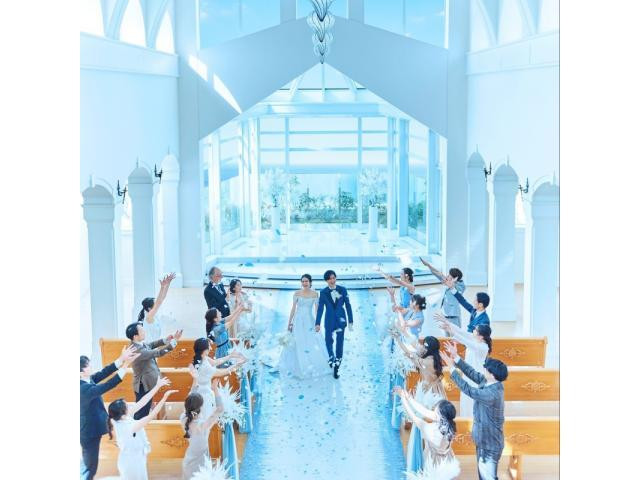 【水上に浮かぶ独立型大聖堂で挙式体験】天井高10M・バージンロード20Mの圧巻のスケール感。自然光が降り注ぎ青×白のコントラストが美しいと話題。挙式の後は大階段で憧れのフラワーシャワーも叶う