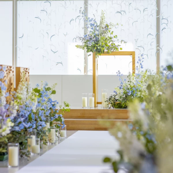 メインテーブル装花30000円フローリストと打合せをしてフルオーダーでつくりあげていきます。もちろんお任せもOK!テーマカラーを決めたり、小物とミックスさせたり自由度の高さも魅力的 (プランに含む)