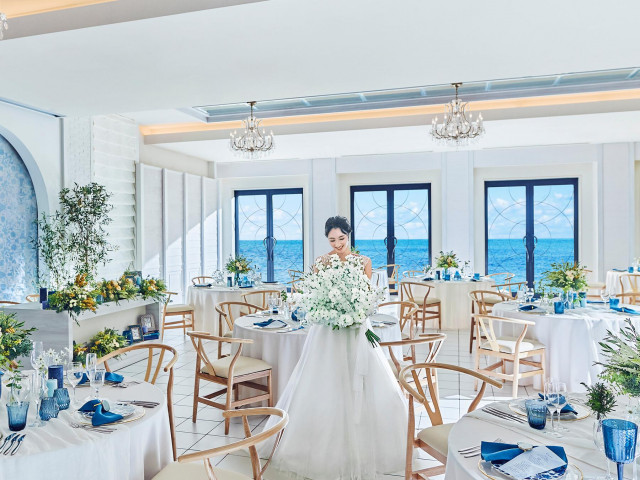 【柔らかで心地よい『白』という空間】明るい陽ざしにまばゆく輝く純白のパーティ会場。ミコノスブルーのインテリア、ナチュラルな素材の椅子などエーゲ海に浮かぶヴィラを思わせる居心地の良い空間が広がります。