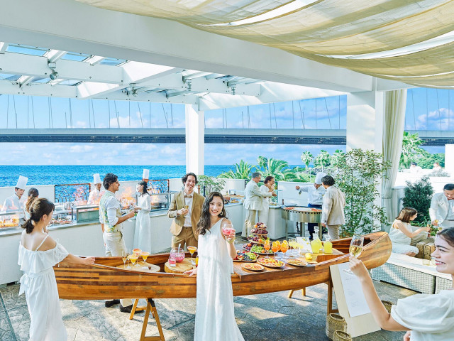 | ガーデン演出 | 有り海が目の前のガーデンはゲストと触れあいワイワイ楽しめるスペース! |