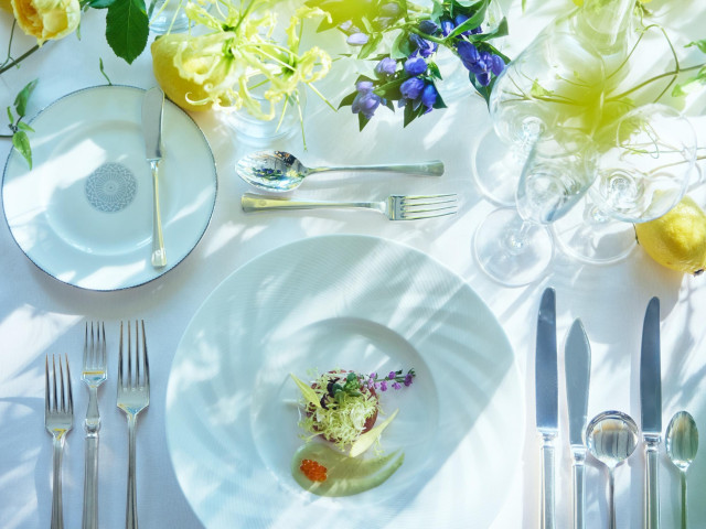 人気のウエディングメニュー〈エスポワール〉より、柔らかく、断面の美しいジューシーなメインディッシュ「牛フィレのポワレ」と、祝宴の始まりを彩る華やかな前菜の2皿をお召し上がりいただけます。