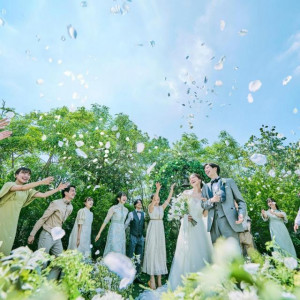 | ガーデン演出 | 有りゲストを囲んでのデザートブッフェや、ゲストからのフラワーシャワーは、映画のワンシーンのよう・・・。 |
