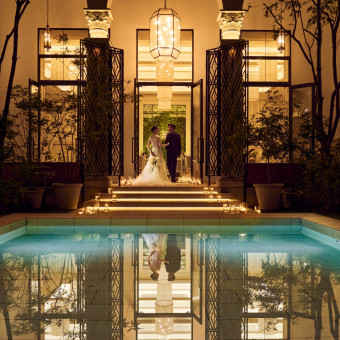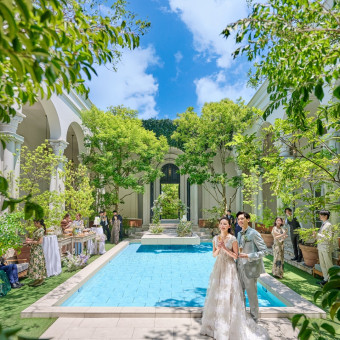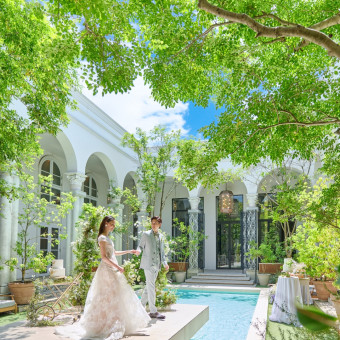 邸宅に切り取られた青空さえも独占しているかのような気分に浸れるガーデン。白亜の円柱やクラシカルな石畳、青くきらめくプールなど、フォトジェニックなスポットも満載なので、記念の一枚をより印象的に残せます。