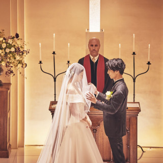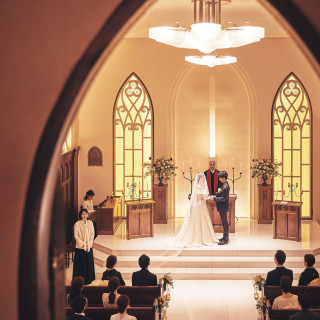 アーチを描いた天井高6mの空間に聖歌隊・オルガン・バイオリンの生演奏が美しく響き渡る。入場時には自然光がふたりを包み込み、うっとりするほど神秘的なシーンに。大理石のバージンロードには花嫁姿が映り込み、挙式本来の意味を大切にした本物の結婚式がはじまる