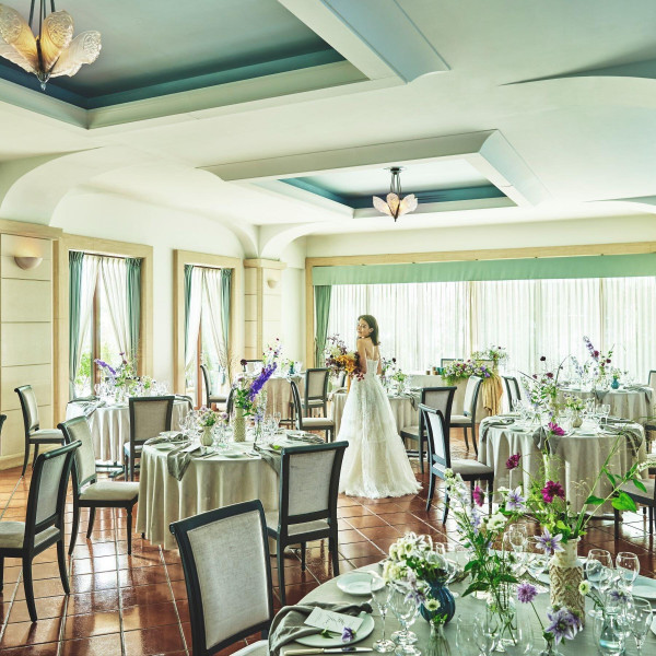 緑に囲まれた独立型教会。白亜のやわらかい雰囲気が広がるチャペルは、キャンドルの灯りも美しく映える。名店レストランで叶う全館貸切×美食のおもてなしは、ゲストからも高評価