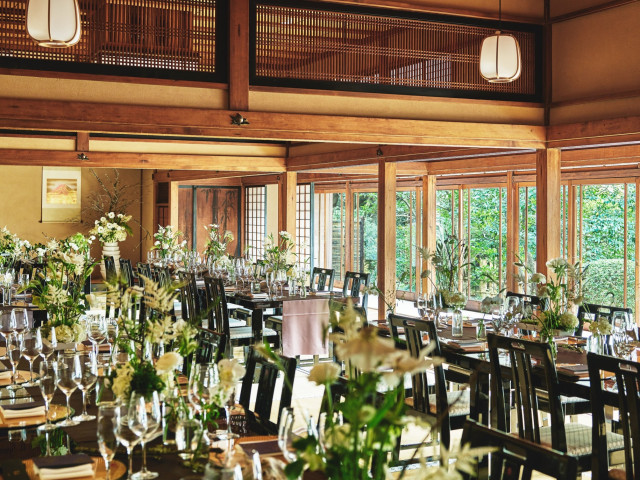 【すべての会場から美しい緑が見える】明治神宮の豊かな緑とテーブルコーディネートが溶け込むフォレストテラスの全ての会場は、少人数会食から盛大なご披露宴まで検討人数やスタイルに合わせてご提案。