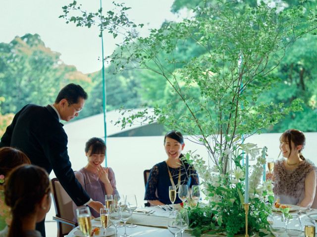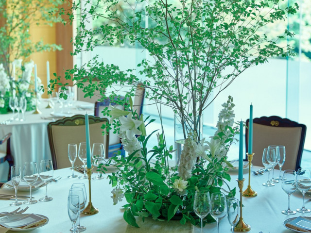【すべての会場から美しい緑が見える】明治神宮の豊かな緑とテーブルコーディネートが溶け込むフォレストテラスの全ての会場は、少人数会食から盛大なご披露宴まで検討人数やスタイルに合わせてご提案。