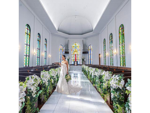 【純白大聖堂で挙式体験】ステンドグラスから射し込む温かな自然光が、花嫁様をより美しく魅せる。聖歌隊による生歌・生演奏が荘厳な雰囲気を創り出します。某有名映画でも使われた大聖堂を是非体験して下さい。