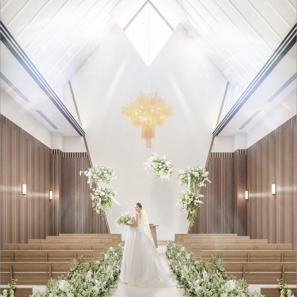 独立型のチャペルは自然光が溢れ、木目と緑の落ち着いた空間。大切な方だけをお招きして誓いを交わす神聖な時間をお過ごしいただけます。