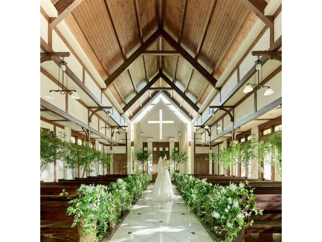 【木の温もり感じるチャペル入場体験】緑に囲まれたチャペルは、大切な皆様と過ごす挙式にぴったりの温もりを感じる場所。フラワーシャワーなどゲストとの時間を過ごせるガーデンも合わせてチェック!