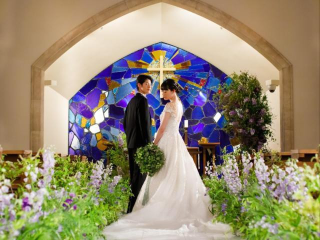 【独立型×幻想的なステンドグラス】ホテル7階の屋上庭園に佇む天空チャペルは街の中心にいるとは思えないほどの緑と青空に包まれ開放感抜群!挙式後はお庭でゲストと楽しむセレモニーも好評で非日常的な時間に。