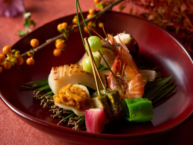 【歴史と伝統に培われた繊細な味わい】京都府の現代の名工(京都府優秀技能者表彰)を日本料理部門で受賞、2018年には黄綬褒章を平成天皇より授与。確かな経験を持つ料理長が手掛ける京懐石をコース仕立てで堪能。