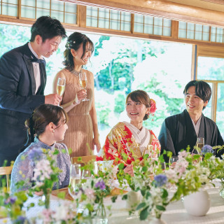 庭園の中でオリジナル人前式から可能。ゲストは室内から観覧。特別感がある。日本庭園があり落ち着く空間があるシンプルだが木を基調とした会場で一部桜の模様がある。ゲストからは庭園の緑が眺められるので、四季折々の植栽がみえる。テーブルコーディネート次第でナチュラルにも和風にも自分達のやりたいようにできるのはおすすめ。南禅寺がすぐ近くにあり、京都ならではの観光地がそばにある。駅からは少し歩くが、歩いた先には回りの景色が見えない静かで落ち着いたロケーションも魅力のひとつ。料理はお箸で食べられる京懐石料理でとにかく美味しい。器も目でも楽しめる色使いで和を感じられる。魚やお肉も美味。和装での挙式や、海外挙式のあとのアフターパーティにもおすすめ。足元悪い人の導線ややりたいことができるのかきちんと確認した方が良い。和を感じたいカップルやお年寄りが多いゲストにはお箸で食べられる京懐石は喜んでもらえる詳細を見る (394文字)
