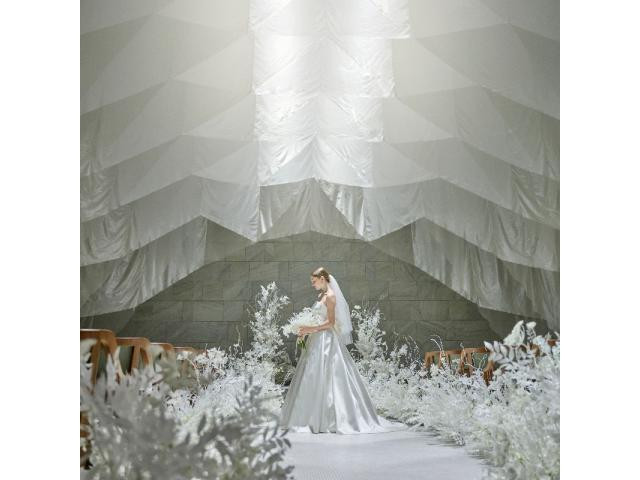 【唯一無二の『デザイナーズチャペル』で入場体験】◆幾重にも重なる白いヴェールと光が幻想的◆「初めて見るデザイン!」とゲストにも好評◆フェアでは、オリジナル演出の体験も◆大階段でのフラワーシャワーも叶う